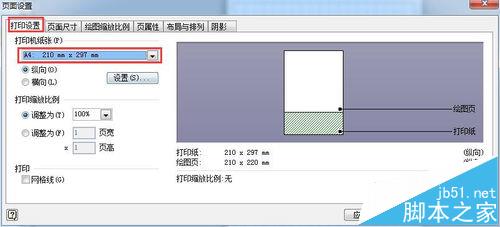 4、注意上一步输入的尺寸大小必须保证绘图页在打印纸内(上图右侧灰色区域可以判断),如果超出打印纸范围,可以在此对话框的打印设置面板更改打印纸的尺寸。如下图所示: