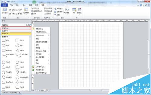 5、待页面尺寸设置完成后,点击窗口左侧形状窗格的“更多形状”(若窗口左侧没有形状窗格,则用鼠标左键依次点击菜单栏 视图 → 显示工具框中任务窗格里的“形状(S )”即可)。如下图所示: