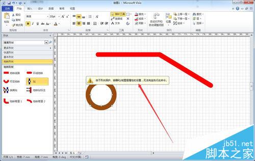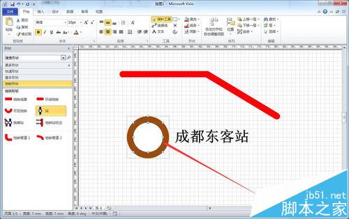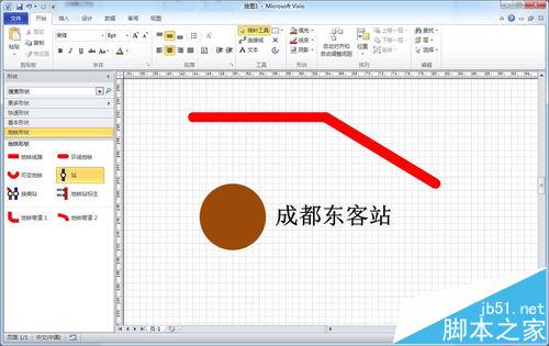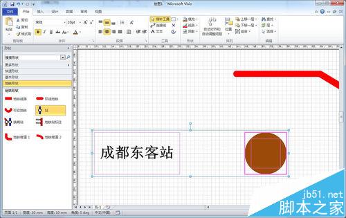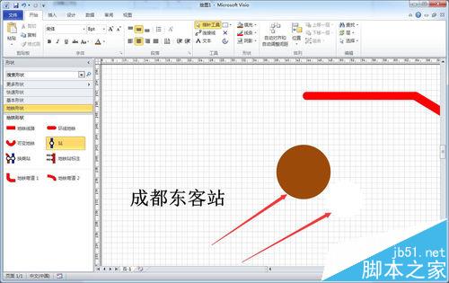 1、从左侧形状窗格中拖入地铁站点图标,默认是由灰色圆与白色圆叠加组合的图形,选中站点图标可以拉大和缩小。如下图所示:
