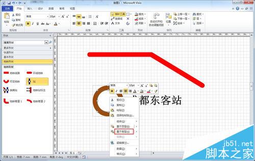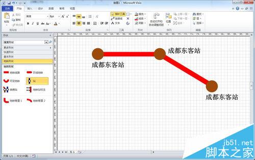 7、对于换乘站点,如果不使用左侧形状窗格中标准的换乘站点来严格区分,可以通过将普通站点拉大来区别(比如本文第一张图)。此外,站点的备注文字也可以通过“菜单栏插入 → 文本工具框的文本框”添加,然后再决定是否与站点图标组合。