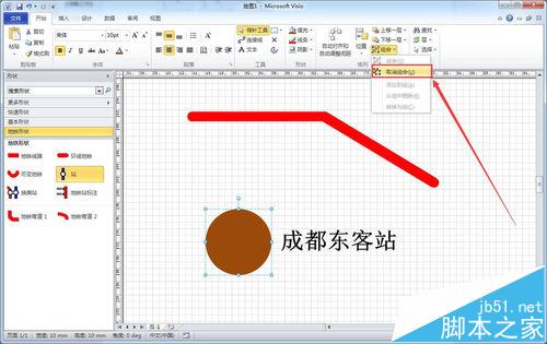 4、当想调整站点备注文字,移动时却是整个站点图标一起移动。此时,选中站点图标,点击开始菜单选项排列工具框中的组合下拉菜单,然后选择“取消组合”(或者右键点击站点图标,选择“组合→取消组合”),会弹出操作警告对话框,点击确定即可,执行后之前的站点图标即现出了“原形”,便可对站点的备注文字单独地进行位置移动。如下图所示: