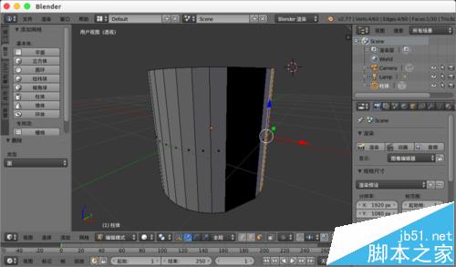 1、今天是在编辑一个模型,“编辑模式”中选择两根线,然后“W”选择“桥接多组循环边”生成新的面,去掉外面的面就发现这个创建的面与其它的外面不一样,是黑色的。