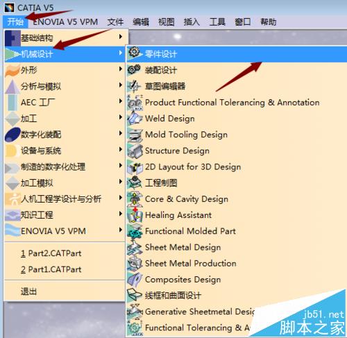 2、点击打开界面中最上面的菜单栏中,找到开始命令,左键点击开始命令,在弹出的下拉菜单中选择机械设计,然后找到零件设计如下图;