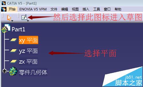5、在零件件设计界面,点击选择X、Y、Z三个平面中的一个平面,然后点击进入草图绘制,如下图