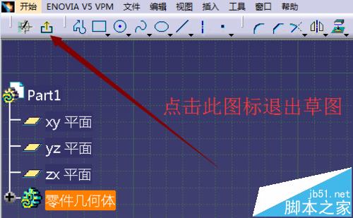 6、如果绘制完成后,需要退出草图。只需要点击退出工作台即可回到零部件设计界面。具体如下图;