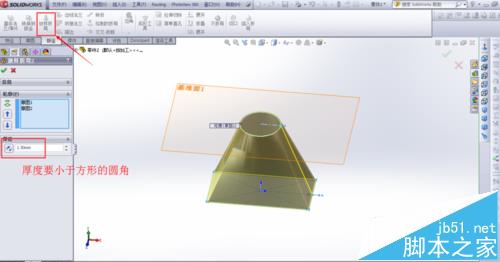 5、选择钣金下面的放样折弯命令,依次选择草图1和草图2,并注意下面的厚度值(注:值要小于之前方底的圆角值才行)。确定退出完成圆顶方底建模。