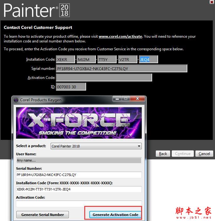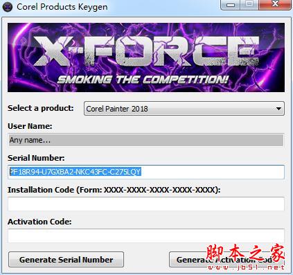 7、运行注册机xf-corelkg.exe,选择Corel Painter 2018,输入序列号Serial Number完成安装