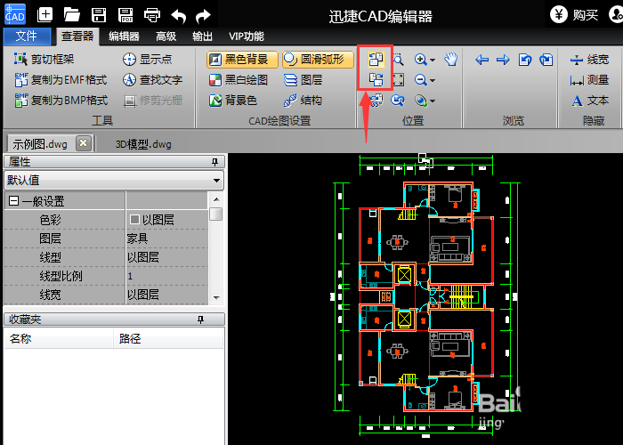 3、将CAD图纸打开之后,点击软件界面的“查看器”选项,然后在“位置”工具中点击“逆时针旋转”或者“顺时针旋转”按钮,即可对CAD图纸进行旋转,旋转角度固定90度。