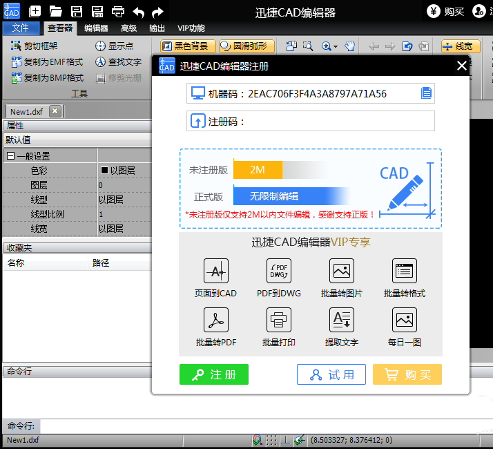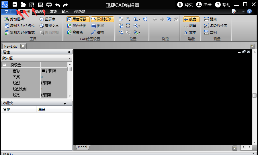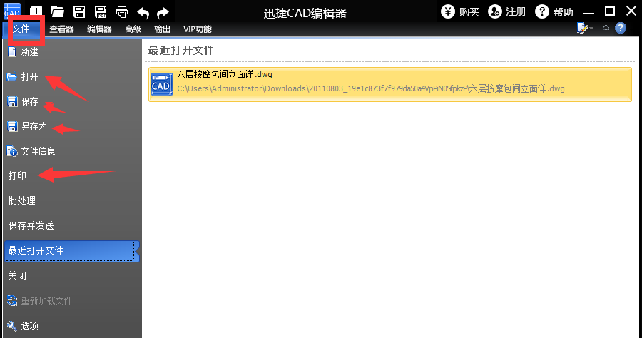 3、可以先看看“CAD编辑器”都有一些什么功能。在最上面的一排的功能是以图标的形式显示的。有“打开”“保存”“保存为PDF文档格式”的等等的一些实用的功能。