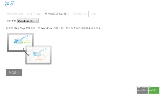 3、随即跳出演示模式下的多种导出形式,其中就有一个选项为“单个动画效果幻灯片”,可以将我们的导图放置到单一的PPT幻灯片里,然后分支将以动画效果逐个演示。