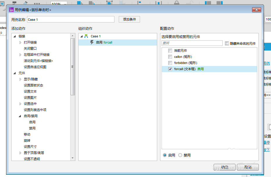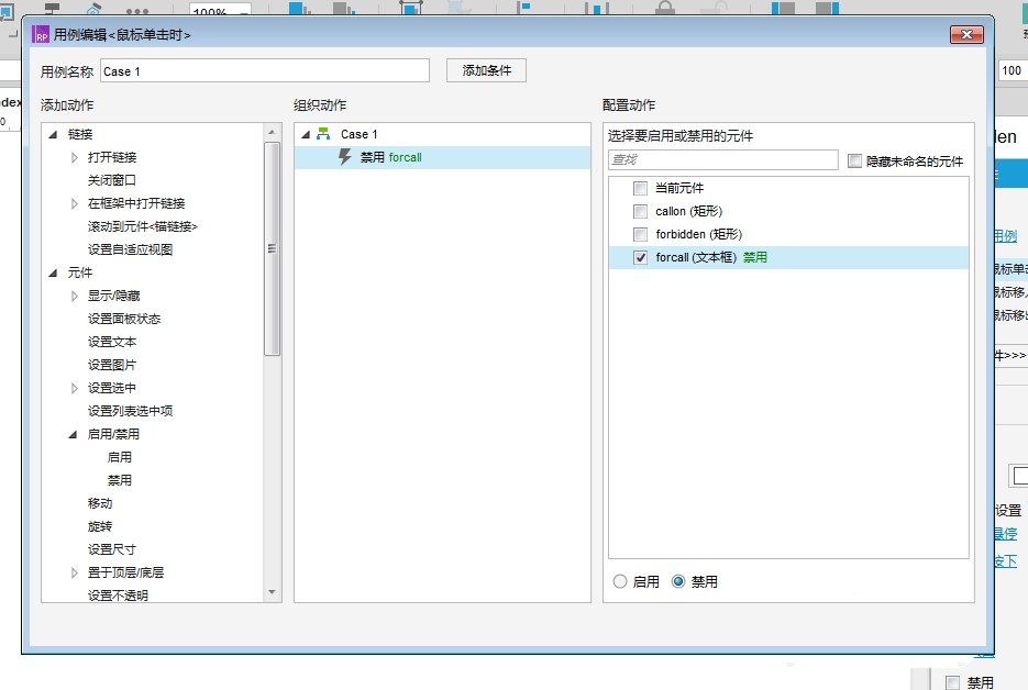 5、选中禁用按钮,点击“鼠标单击时”属性设置,打开窗口用例,如下图所示: