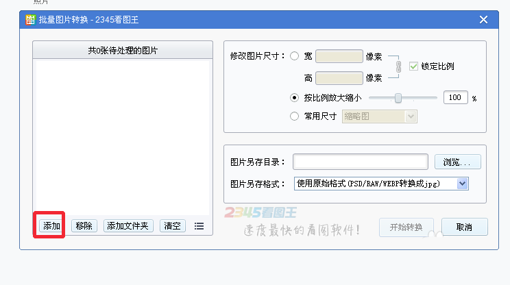 4、直接来到批量批量图片转换的主页面,我点击下边的添加