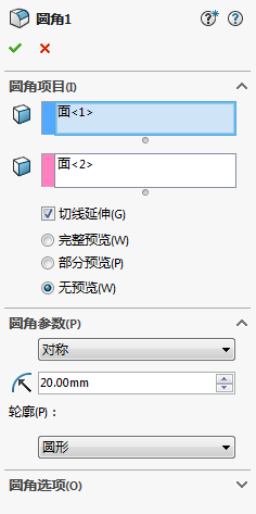 11、单击[圆角]按钮,在对话框中,[圆角类型]选择[面圆角],[圆角半径]设为20mm,然后选择步骤10镜像后的两个镜像面,单击[确定]按钮,生成圆角特征。