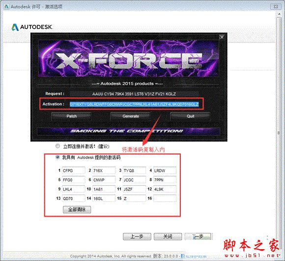 11、把注册机第二栏生成的激活码,复制到激活界面的文本框里,点击“下一步”。