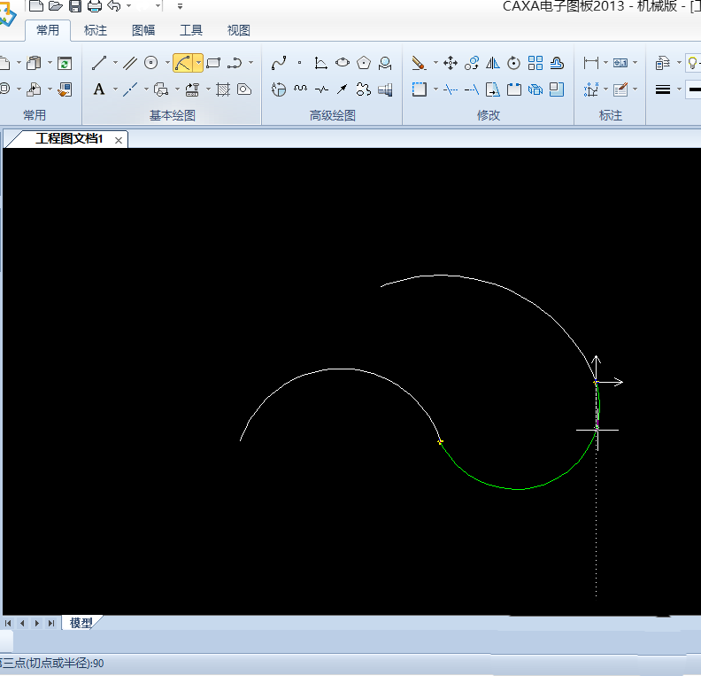 3、是两点加半径画出其圆弧,依次点击两点,然后在左下角输入半径,这里已90为半径如图。