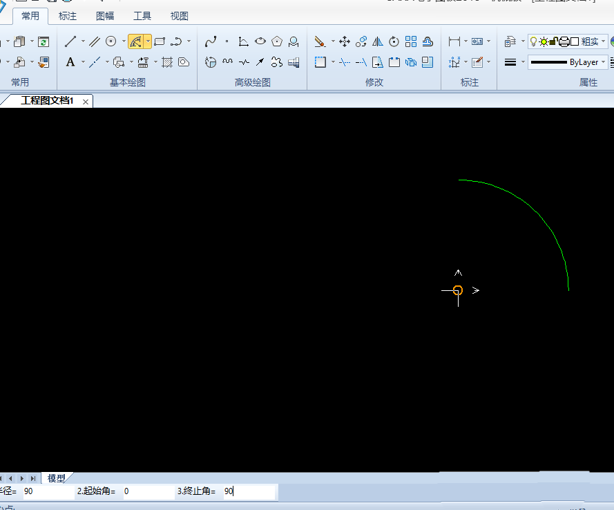 5、是半径,起始角,终止角画圆弧。在左小角输入所要求的值即可画出。下图已半径90,起始角0度,终止角90度为例。
