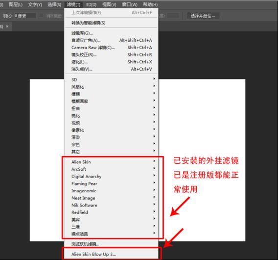 5、完成安装后,所有的集成的所有外挂滤镜均可正常使用,原来的手动注册即自动完成;