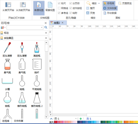 2、新建空白的画布,查看左侧标注和实验器皿,如下图所示: