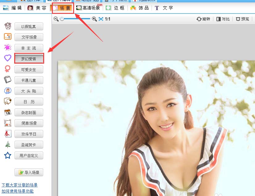 5、在该界面内找到场景选项,并在其内找到梦幻爱情选项,如图所示: