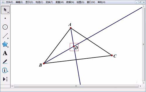 2、构造角平分线。依次选择点A、B、C,选择“构造”—“角平分线”命令,作出角ABC的角平分线。相同的方法作出角BAC的角平分线,注意选取点的顺序。点击两个角平分线的交点,命名为D。