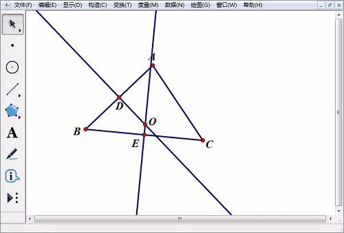 3、选择线段AB和点D,执行“构造”—“垂线”命令,做出线段AB的垂直平分线。相同的方法构造线段BC过点E的垂线。两条垂直平分线的交点为“O”。