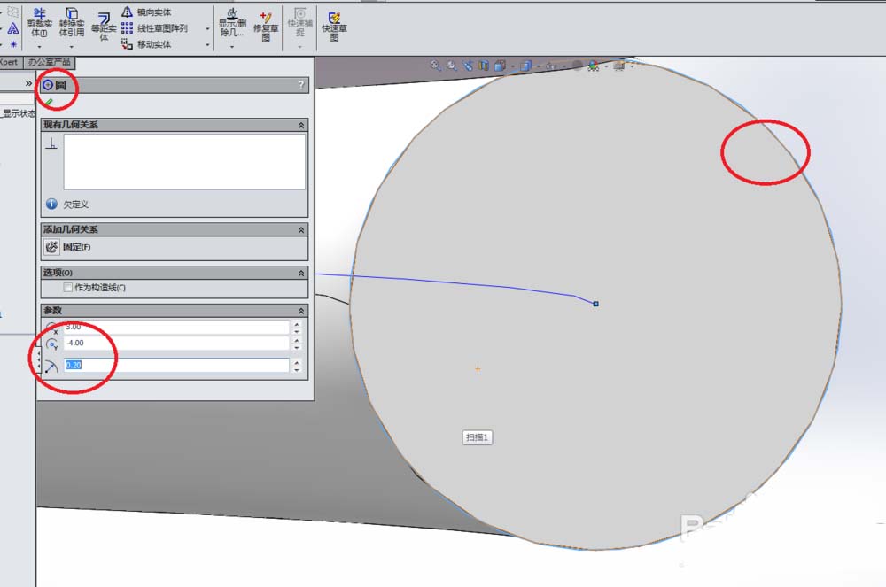 10、如下图所示,继续画一个圆,圆必须与扫描的截面重合,所以尺寸必须是直径0.4(半径0.2——没办法,SolidWorks一般显示半径)。完成圆的绘制之后,记得要退出草图哦!!!