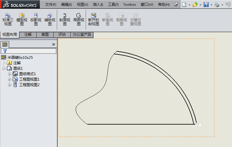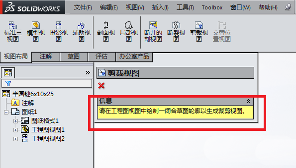 2、如下图所示,笔者刚刚打开了事先保存好的SolidWorks工程图,兴冲冲地去点击“布局视图”工具栏中的“裁剪视图”,结果,它给了我当头一棒。