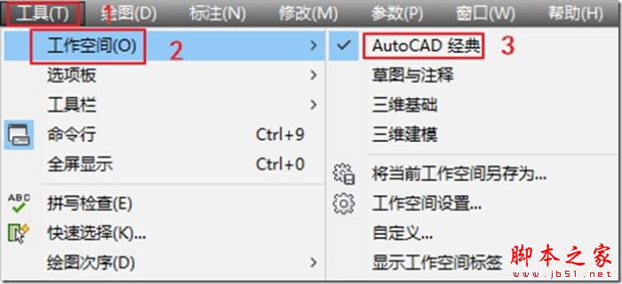 启动CAD程序,点击【工具】栏中的【工作空间】按钮,点击【AutoCad经典】按钮,将工作空间调为autoCAD经典。