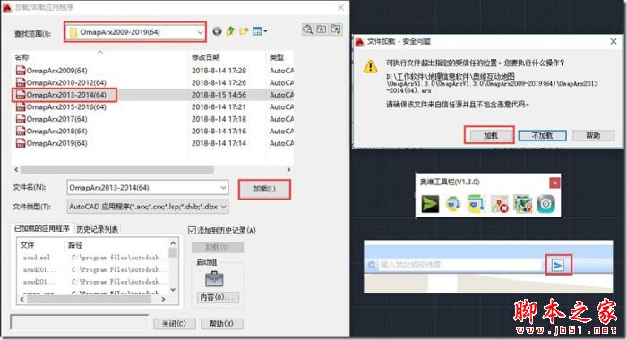 点击【工具】栏中的【加载应用程序】按钮,进入【加载/卸载应用程序】窗口,点击【查找范围】下拉框,选择与CAD版本相对应的插件版本,点击【加载】按钮,执行加载OmapArx插件。
