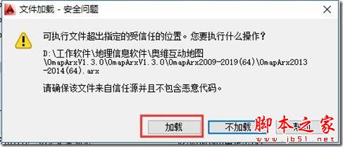 设置完启动组,以后每次启动CAD程序,都会自动弹出【文件加载】窗口,提示“是否加载插件”,点击【加载】按钮,即可加载。若用户不设置启动组,则每次启动CAD程序后,需要手动执行加载操作步骤(步骤1加载OmapArx插件)。