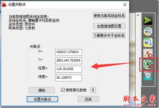 (3)关联点转换坐标:将已知平面坐标值也已知经纬度坐标值的几个关联点作为平面坐标的相对原点。这个坐标系常用于导入即不知道坐标系类型也不知道坐标系参数的CAD图,具体操作请查看