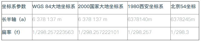 不同的坐标类型采用不同的椭球体作为参考,因此其所投影出来的平面坐标系也会有所不同,下面是不同坐标系的椭球参数。
