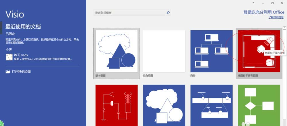 1、启动Visio 2016电子绘图软件,如图所示。拖动右侧垂直滚动条,选择"地图和平面布置图"图标。