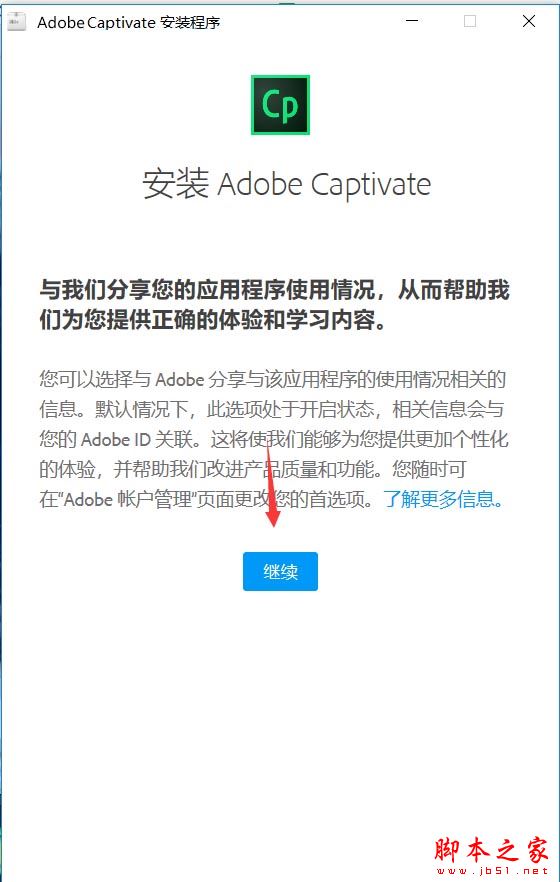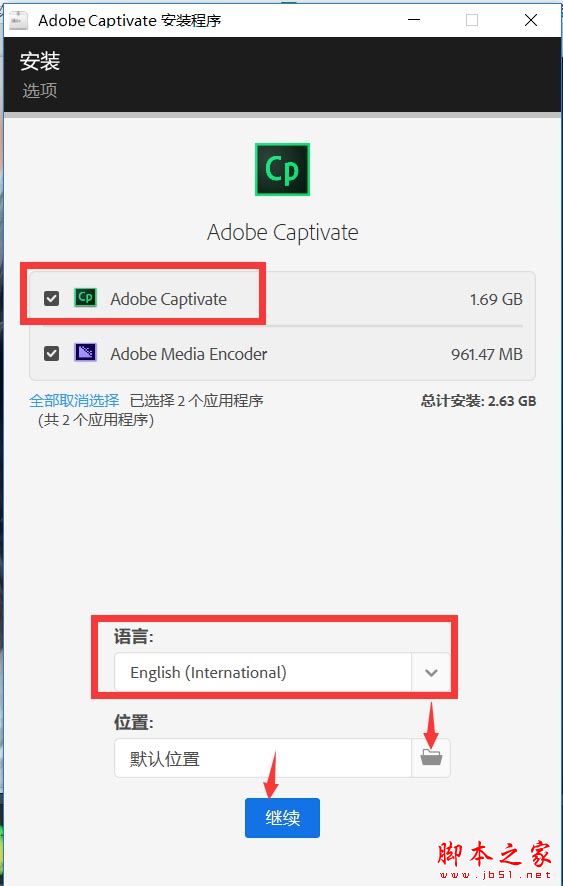 6.选择Captivate 2019。选择安装语言,目前没有中文,后面会更新中文版,选择安装位置,点继续