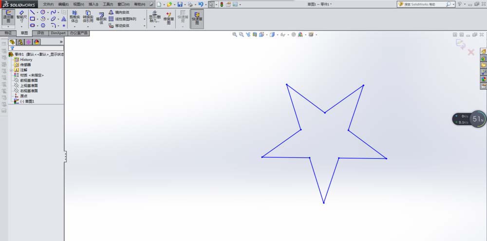 2、以上视基准面为草图平面,进入草图,画一个五角星,如下图所示。具体画五角星的步骤粗略的写一下:
