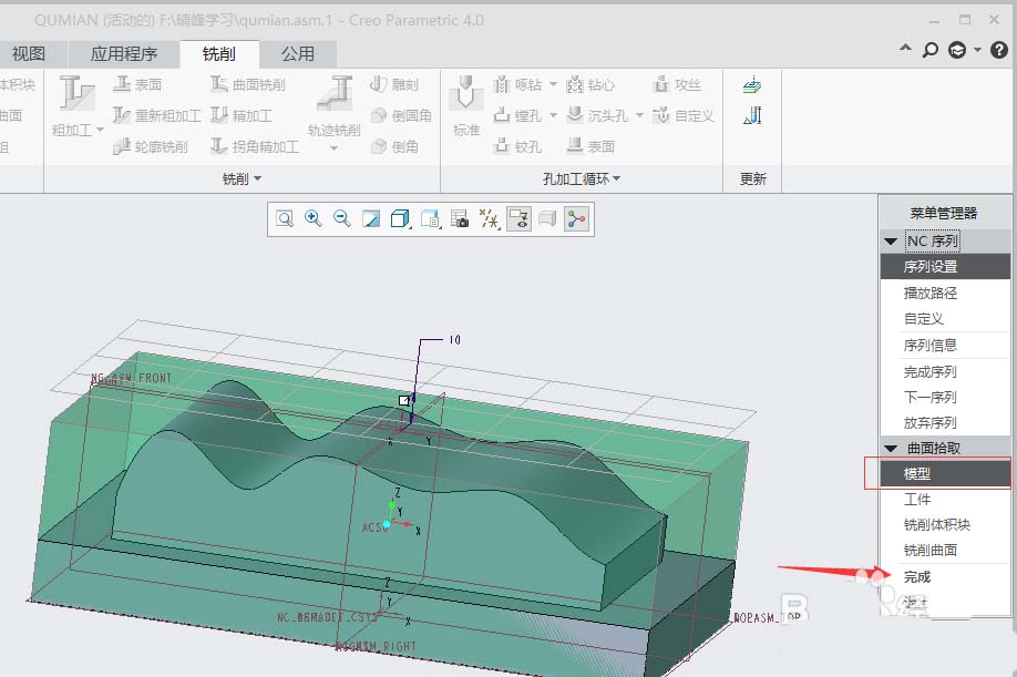 1、打开creo4.0软件,创建一个数控编程文件。引入参考模型及创建工件。