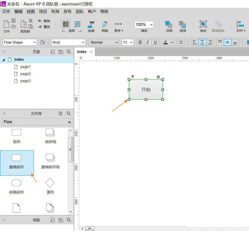 2、圆角矩形代表开始流程,从元件库中拖入一个圆角矩形,双击编辑文字。