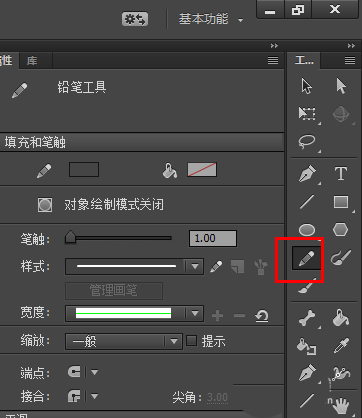 3、此时我们可以在属性框中设置他的笔触和对象模式的开关。