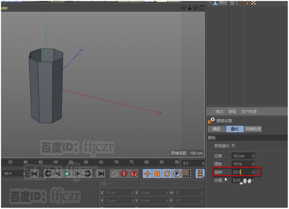 2、要将上面得到的空心管从上端创建出一段90度的弯管。用什么办法最快呢?这里的方法就是直接用旋转工具得到90度的变管。在开始旋转前,先做一个小设置。点模式,在弹出的列表中选建模;在建模设置中修改量化中的旋转数值为:22.5(90度的弯管用4道结构线组成,所以每复制一条线为22.5)。