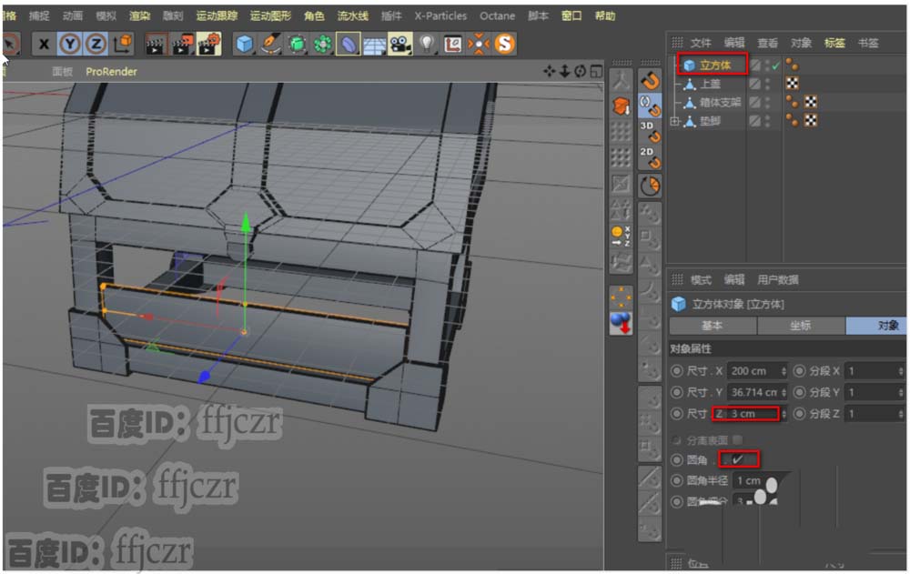10、创建一个立方体,调整其尺寸成厚3的板,长度参照箱体结构来调整;在整个箱体中每个面需要两块板进行拼接。板块记得加上倒角,不然这加上的板块就没有细节了。宝箱更多细节的添加下次再续。