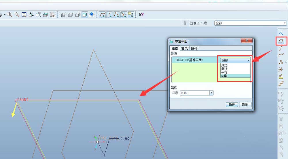 3、找到【平面】工具按钮,点击。弹出创建平面的对话框,我们选择FRONT平面作为参考,可以看到【穿过】、【偏移】、【平移】、【法向】四种平面创建方式,但没有旋转。Proe/Creo中是通过偏移+基准轴的方式来实现旋转平面的创建。