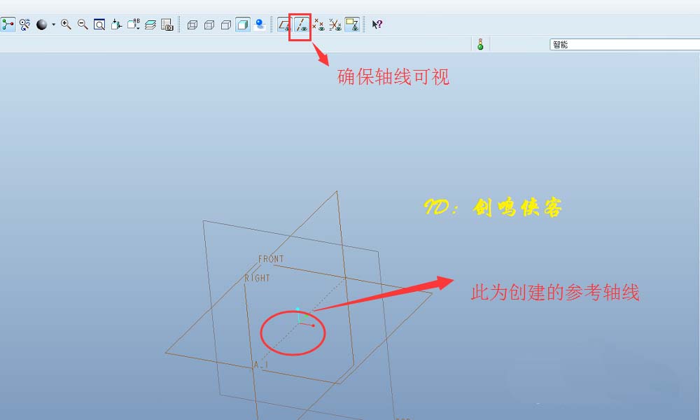 4、在Proe/Creo中,不能选择坐标轴(X、Y、Z轴)作为创建旋转平面的基准。所以,为了旋转平面,我们必须创建一根基准轴。点击【轴】工具按钮,弹出创建轴的对话框。我们按住键盘Ctrl键,依次选择FRONT和RIGHT平面,则获得两个平面的交线——轴A_1。