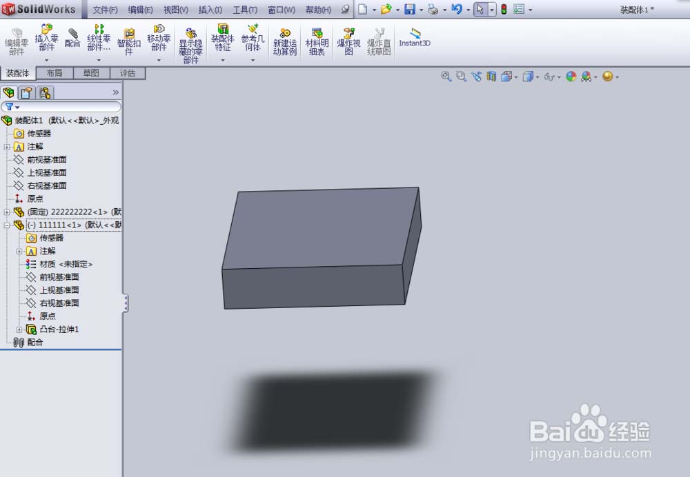 1、这里以一个简单的装配体为例,打开装配体,可以看到一个长方体,然而另一个零件圆柱体却没有看到,也没有将零件隐藏,那么,圆柱体去哪儿了呢?答案在圆柱体零件图里。