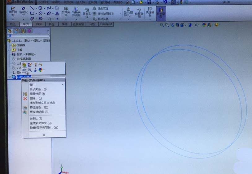 3、请看到左边状态栏的圆柱体特征,右键点击特征,找到一个眼镜的小图标,这时会发现小图标的注解是显示,也就是特征被隐藏了。