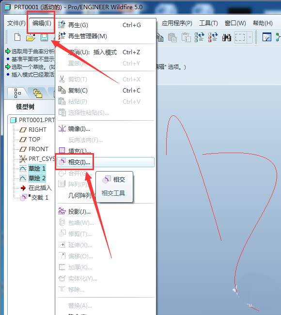 3、选择上述两条曲线,依次点击菜单栏的“编辑”-“相交”。