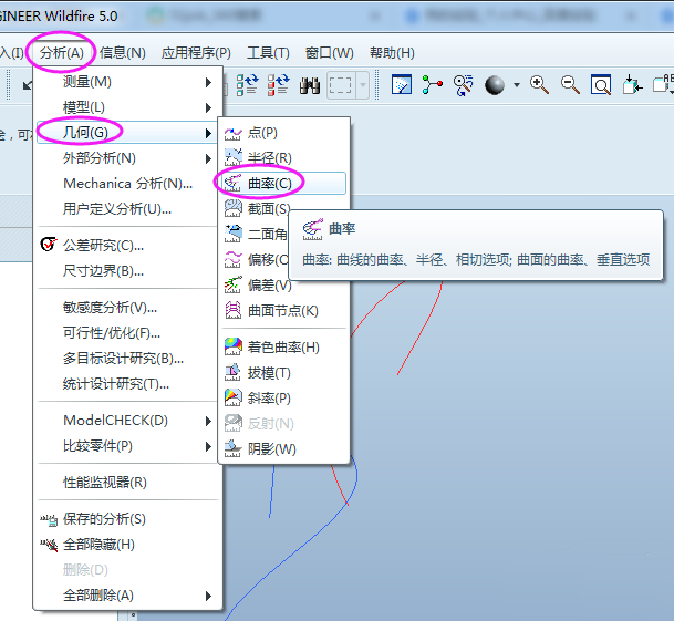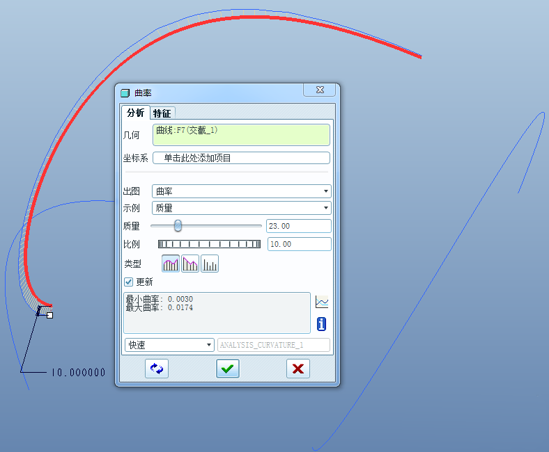 5、依次点击“分析”-“几何”-“曲率”,对该曲线的曲率进行分析,若有问题,可通过调整草绘曲线进行修复。