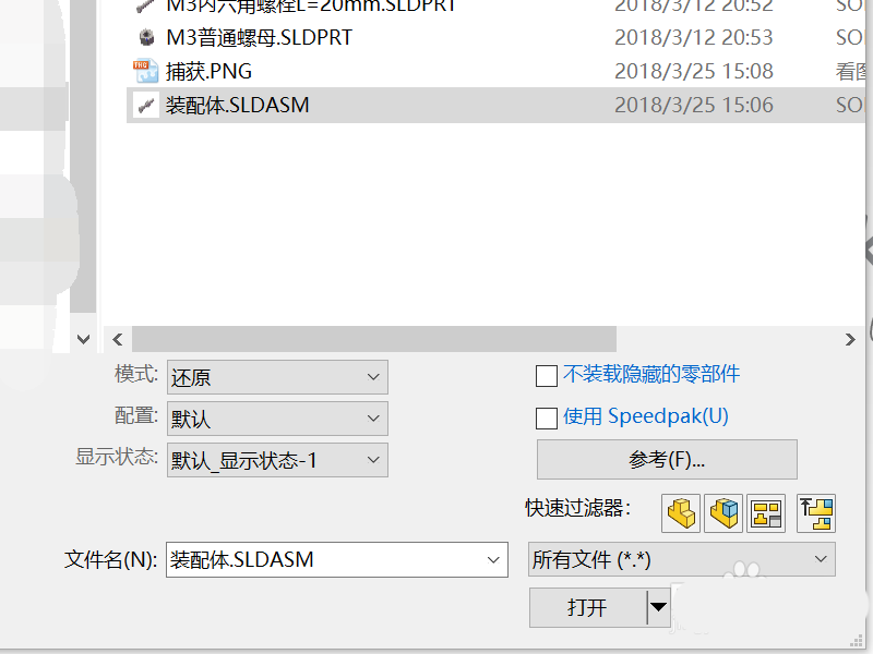 2、选择所需要的装配体,选择打开选项。