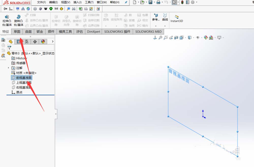 6、进入零件图之后是不能直接粘贴的,我们需要先新建一个草图。