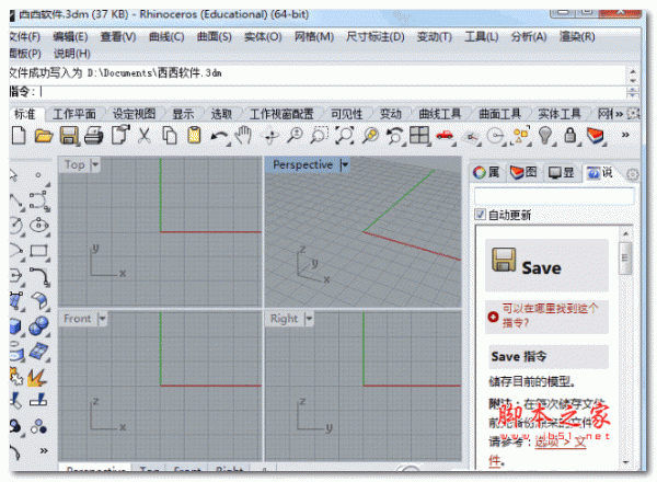 Rhinoceros是以 NURBS 为理论基础的 3D 造模软件,可以建立、编辑、分析及转译 NURBS,以直线、圆弧、圆圈、正方型等基本数学 2D 图形来做仿真,所以可以有较小的档案,非常适合运用于教育学习、游戏设计及工业设计领域。