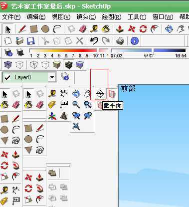 6、接下来我们还需要导出剖面图,先选择SketchUp工具栏上的“截平面”按钮,然后选中剖面工具选择移动工具